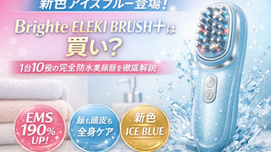 新色アイスブルーが登場したBrighte ELEKI BRUSH+をやさしく解説。EMS刺激190%UP、1台10役、完全防水で顔・頭皮・全身に使える魅力や、買う前に知りたいポイントを分かりやすくまとめました。