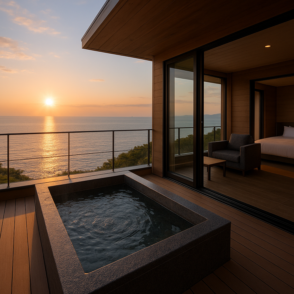 特に注目したいのが、露天風呂のロケーション。テラスと一体化したデザインにより、お風呂に浸かりながら180度の大海原を堪能できる設計です。周囲の視線を気にすることなく、まさに“自分だけの海”に浸っているかのような贅沢さが味わえます。