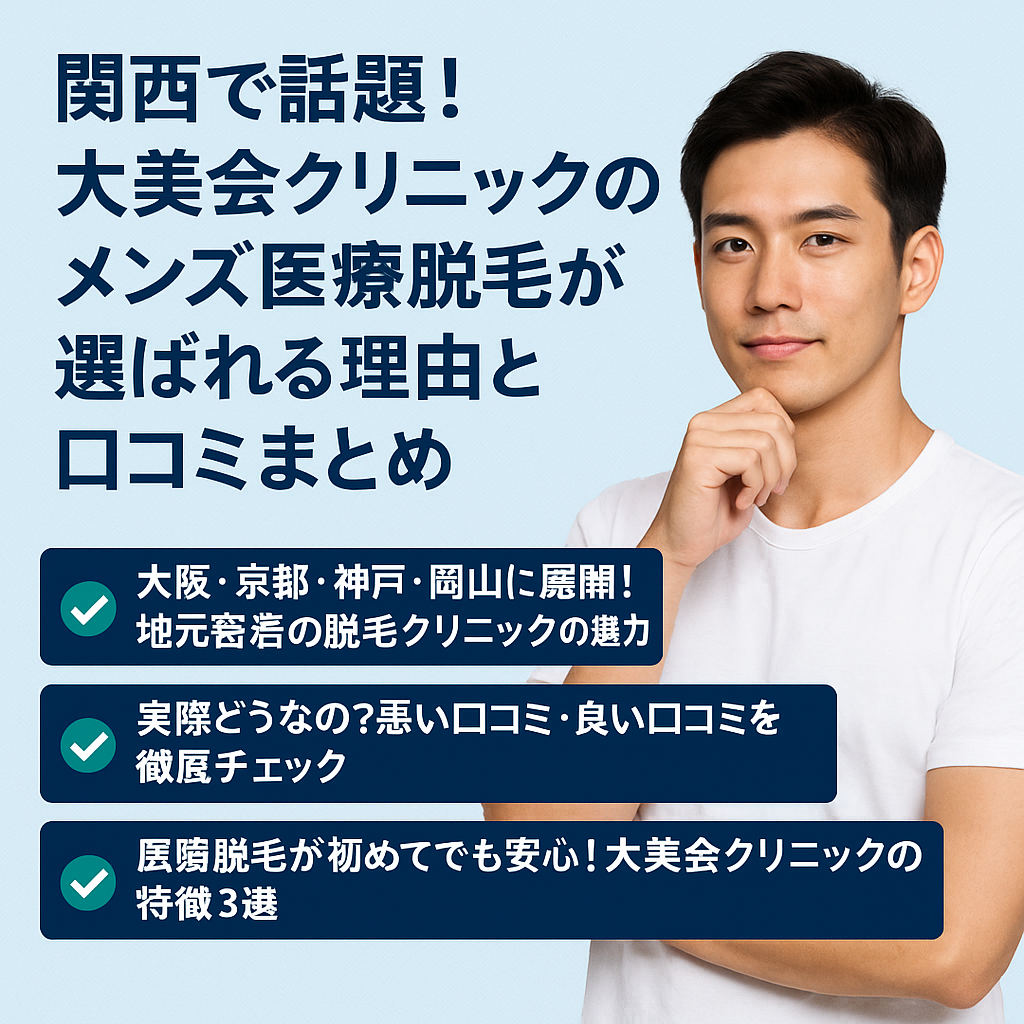 大美会クリニックのメンズ医療脱毛を徹底解説!関西圏(大阪・京都・神戸・岡山)で人気の理由、悪い口コミと良い評判、料金やアクセスまで初心者にもわかりやすく紹介します。