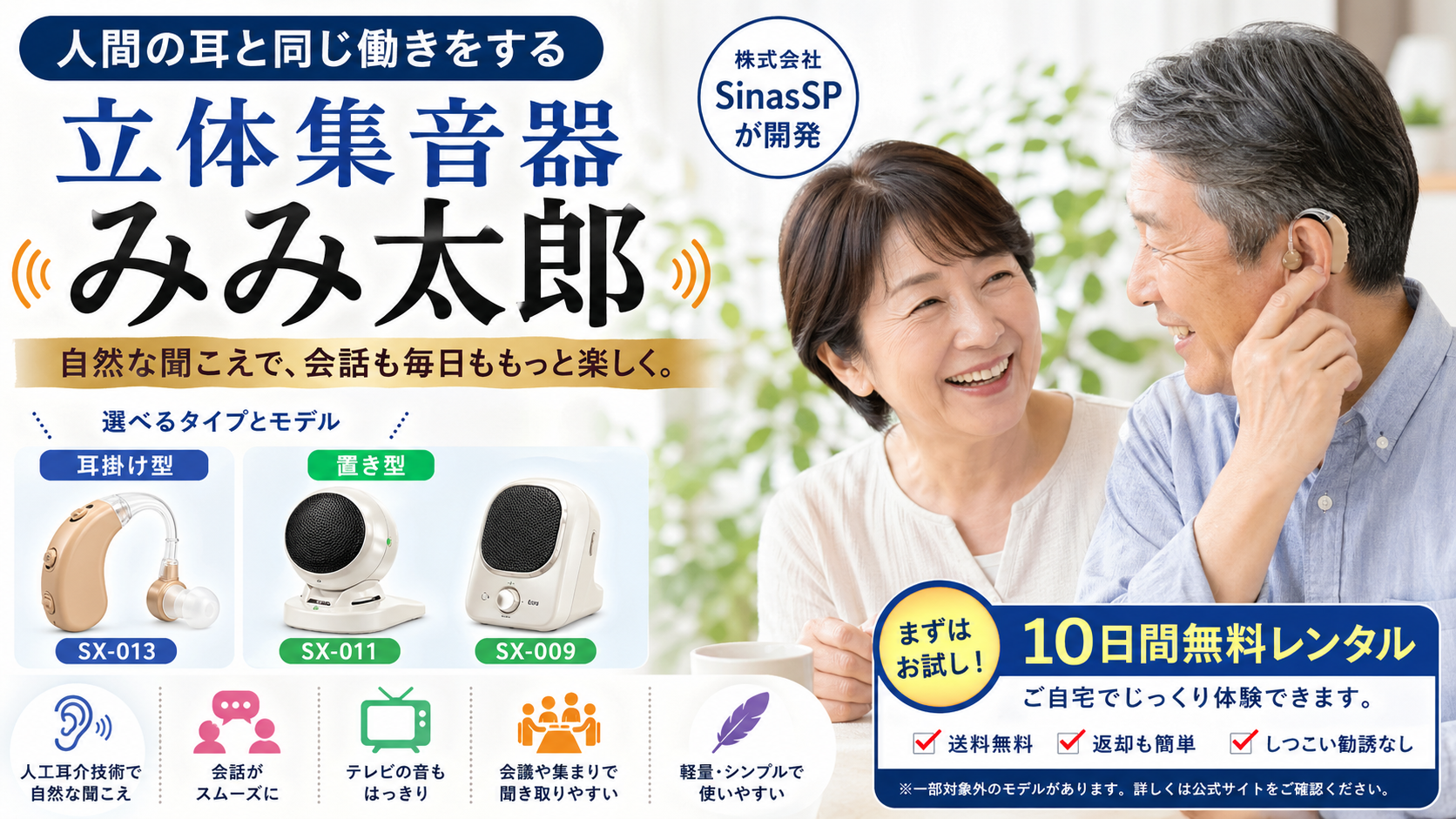 SX-009は、シリーズの中でもスタンダードな位置づけのモデルで、基本性能をしっかり押さえたバランス型です。人工耳介による立体的な音の聞こえ方を体験できる入門機としても人気があります。操作も比較的シンプルで、使い方に迷うことが少ないのが特徴です。また、耐久性にも配慮されており、長く使いたい人にも適しています。特別な機能は少ないものの、日常生活で必要な聞こえやすさはしっかり確保されています。「まずは試してみたい」という人や、「シンプルで十分」という人に向いているモデルです。