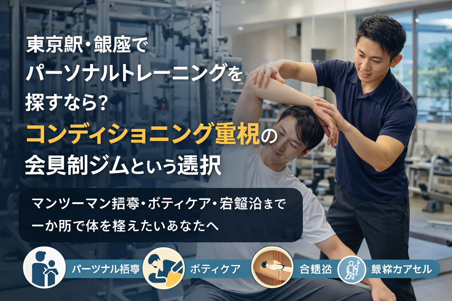 東京駅・銀座エリアでパーソナルトレーニングを探している方へ。コンディショニング重視の会員制ジムなら、マンツーマン指導に加え、ボディケアや足まわりの施術、フェイシャル、岩盤浴、酸素カプセルなどを通して、鍛えるだけでなく整える体づくりが目指せます。運動初心者や不調が気になる方にもおすすめです。
