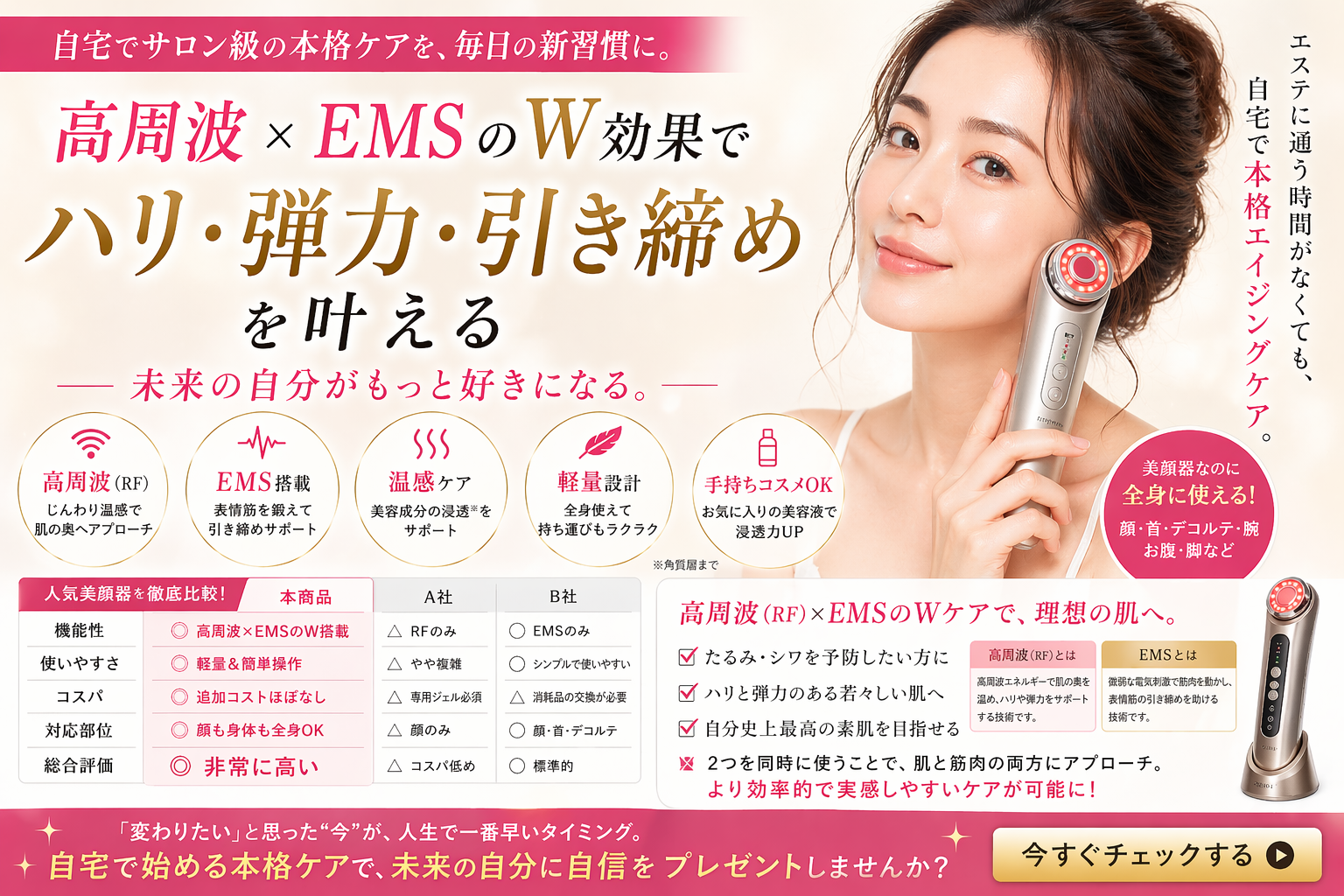 高周波は肌の奥を温めてハリをサポートし、EMSは筋肉を動かして引き締めます。