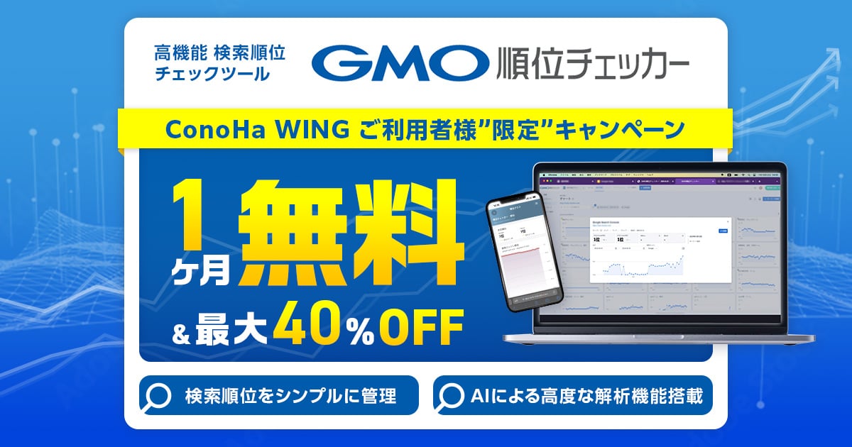 【リリース】[WING]『GMO順位チェッカー』ConoHa WINGご契約者限定!1ヵ月無料&最大40%OFFキャンペーン開始!|レンタルサーバーならConoHa WING